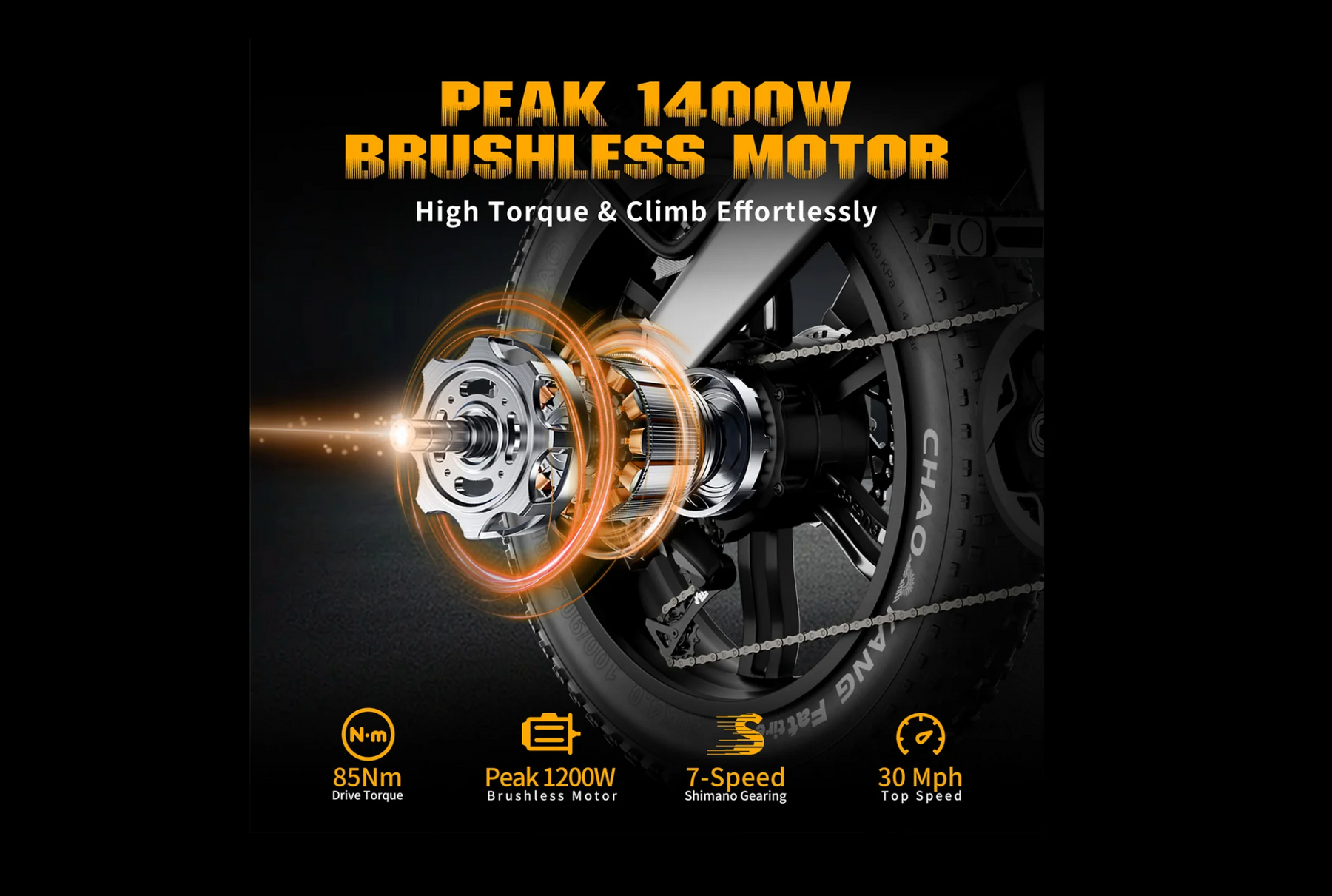 Motor:Β 1400W (peak), 750W (sustained), 48V BAFANG Brushless Rear Hub Motor with 85Nm